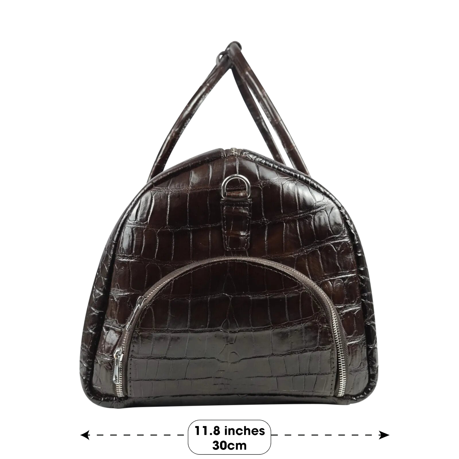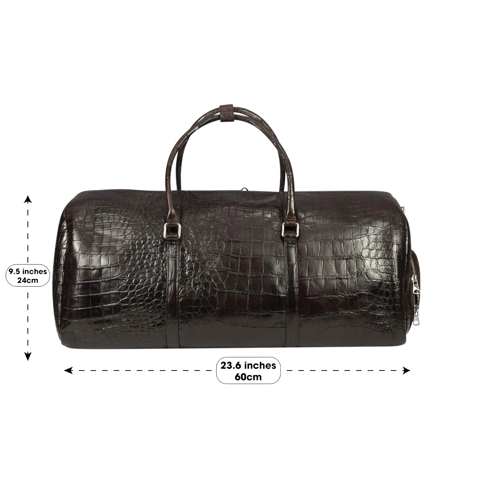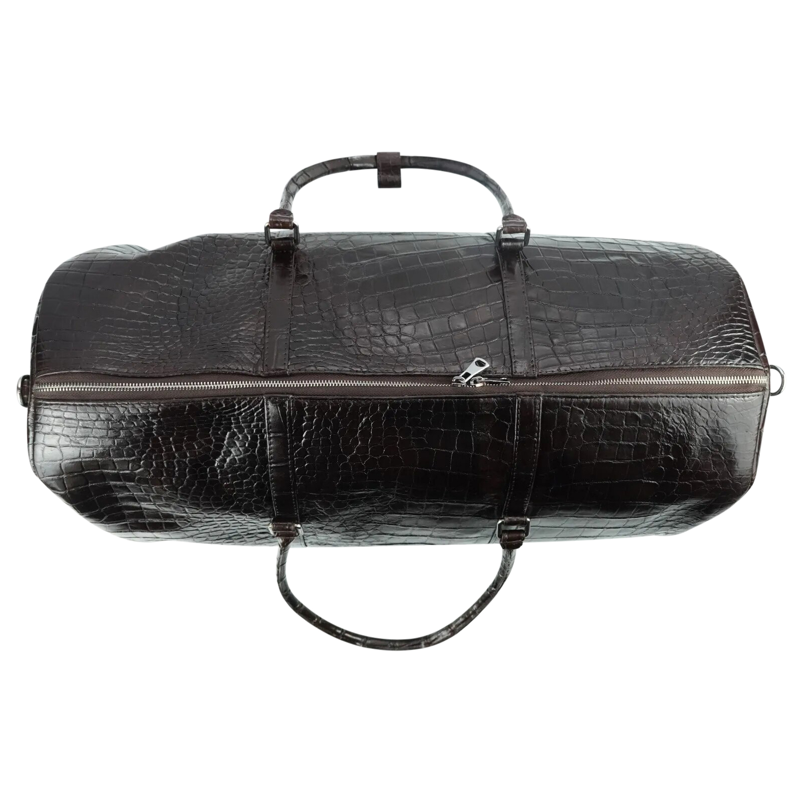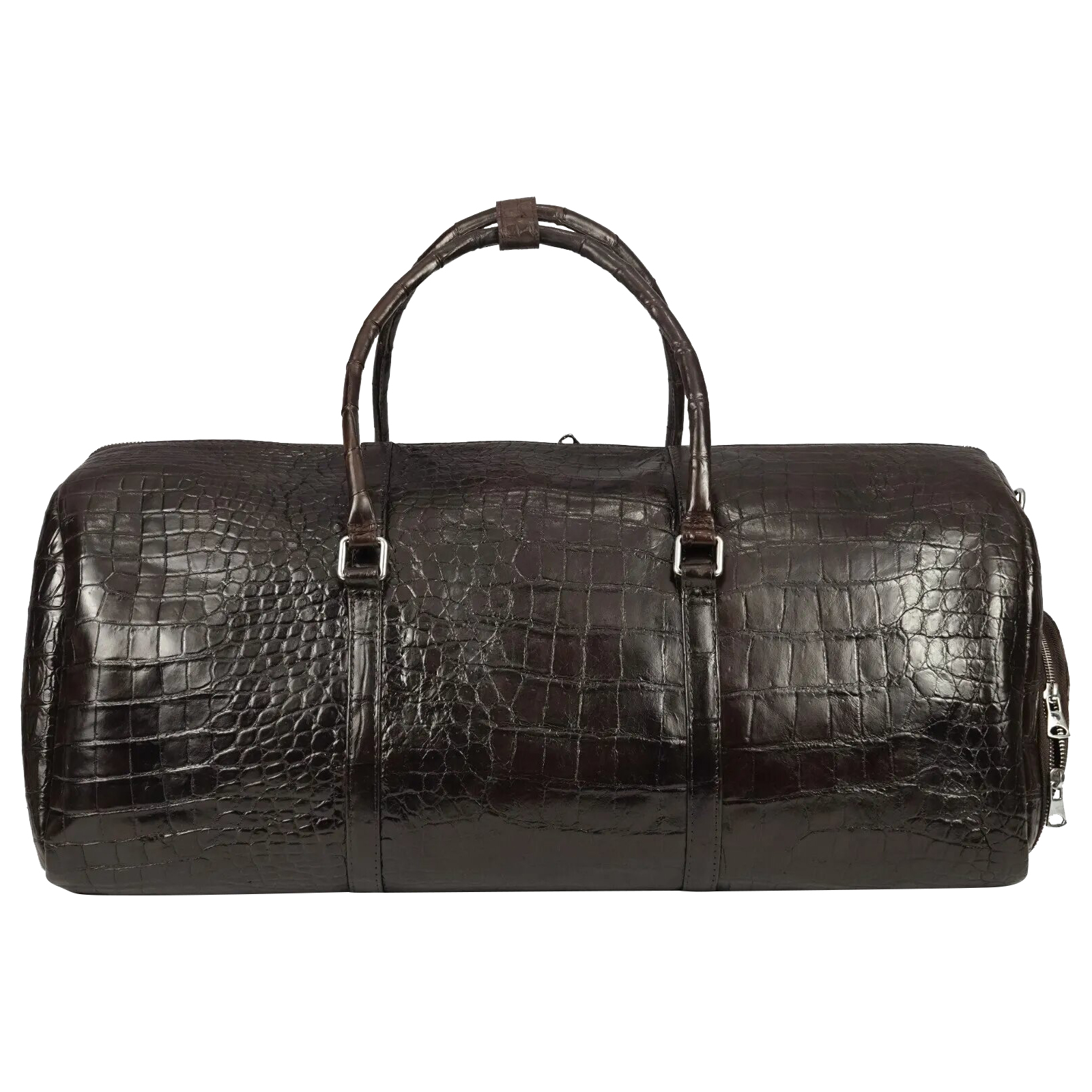 Exquisitely hand-crafted from luxurious alligator skin throughout. Meticulously hand-crafted, painted and sewn. This custom giant duffle travel bag features one large exterior shoe compartment, one zippered interior compartment and one open interior compartment.