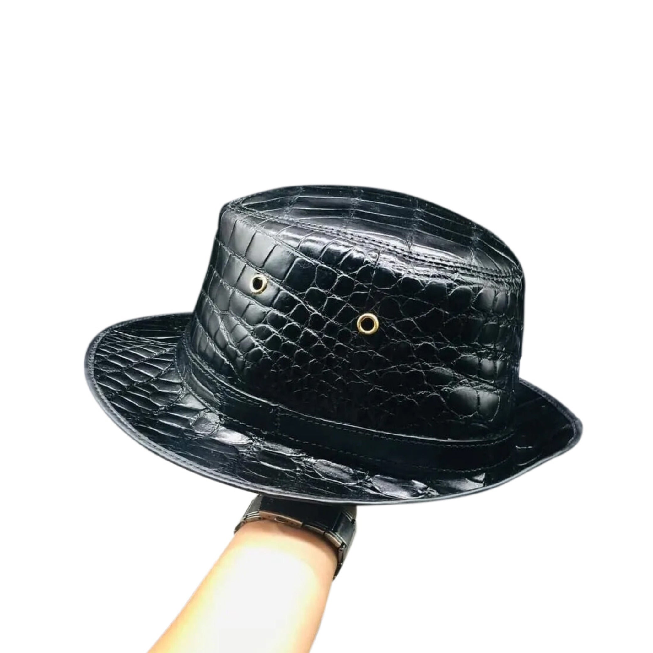 Indulge in the this meticulously handcrafted Gentlemen’s fedora hat, a true masterpiece fashioned from genuine alligator skin. Combining a timeless style with unmatched quality, it serves as a flawless accessory suitable for both formal occasions and casual settings. Make it truly your own with our range of customization options.