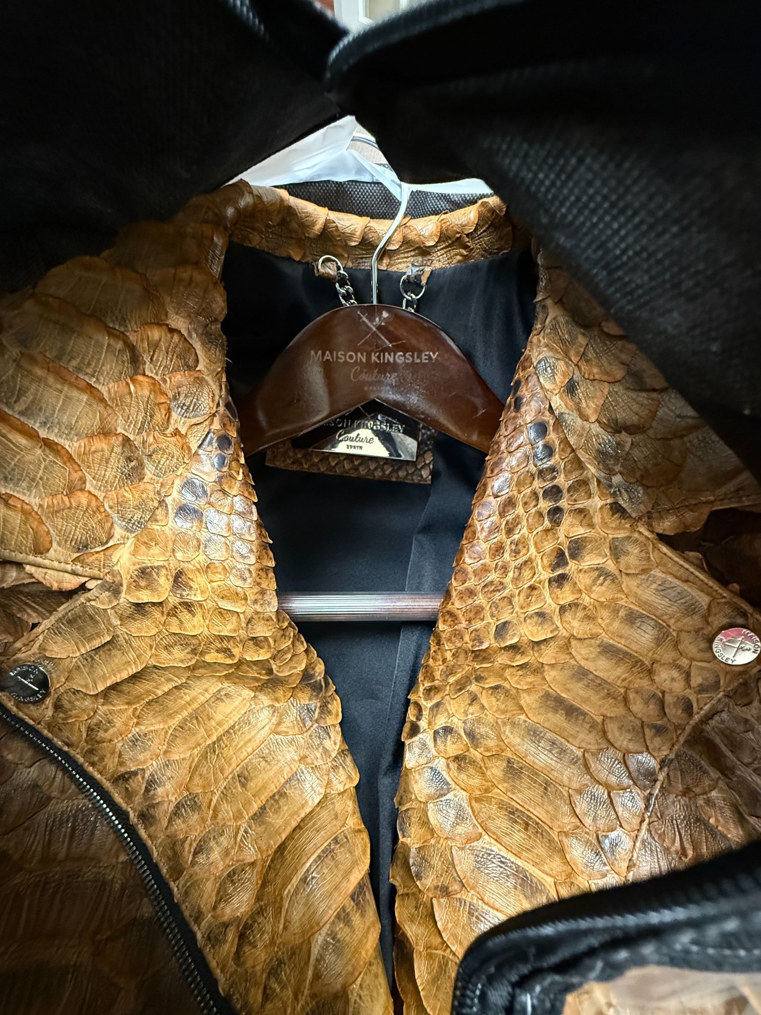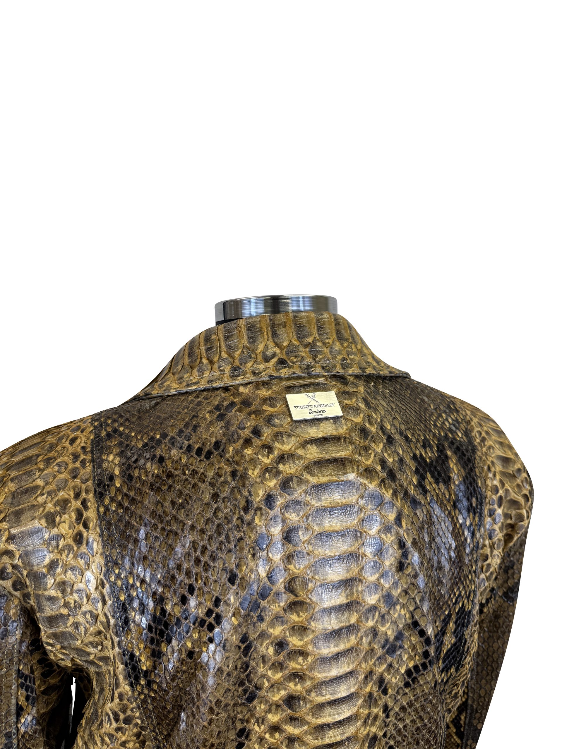 Our Hendrix lines utilize the largest examples of python specimens available, characterized by the unique, massive scale pattern depicted. Hand-crafted with bespoke attention to detail, this Hendrix Python Snakeskin Jacket is presented in a luxurious light brown hue.
