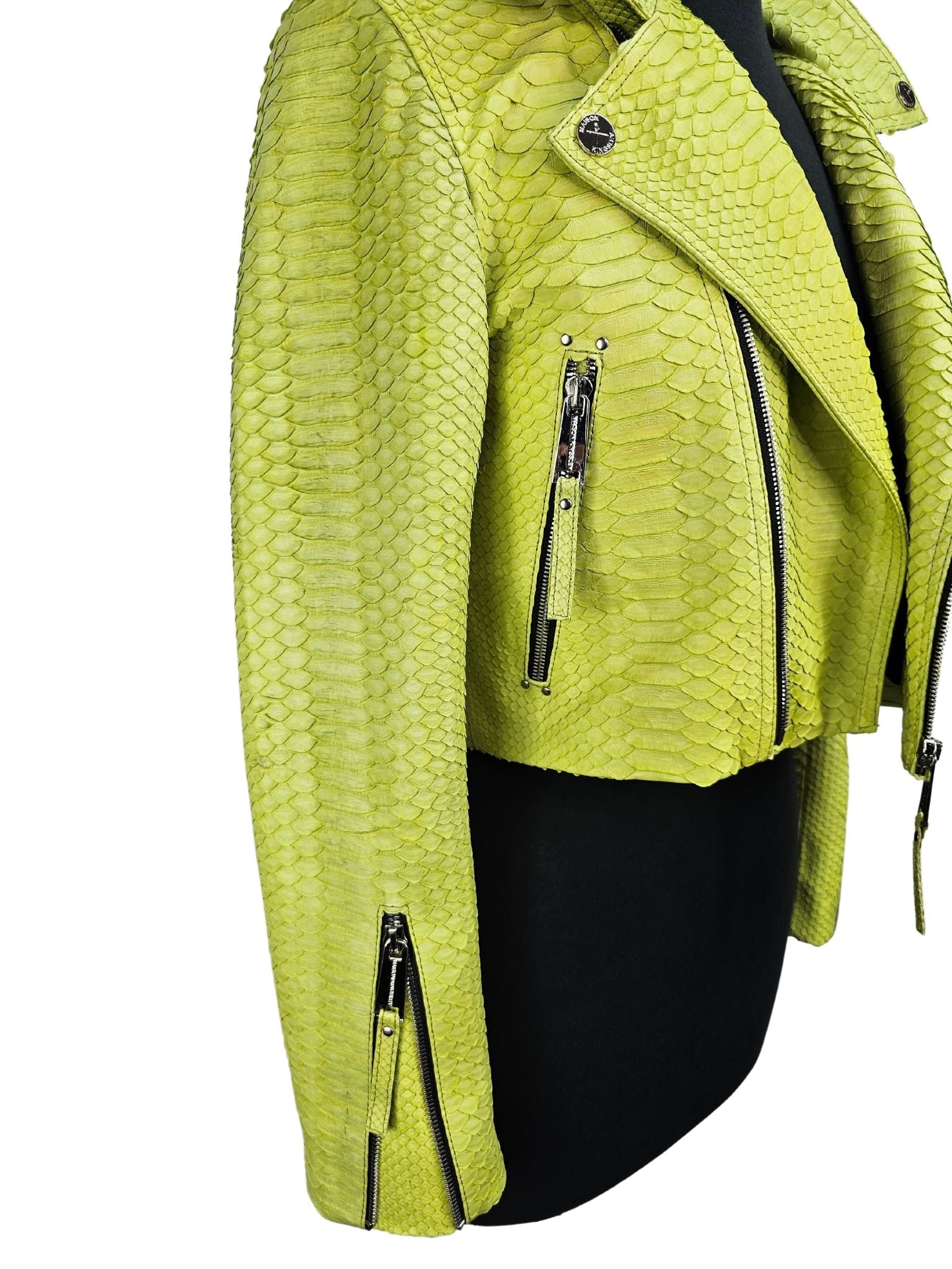 Our Mejor jacket lines utilize the standard reticulated python specimens, characterized by the standard size scales you see here. Hand-made and crafted with bespoke attention to detail, this Mejor Biker Jacket is presented in the natural, luxurious lime green hue.