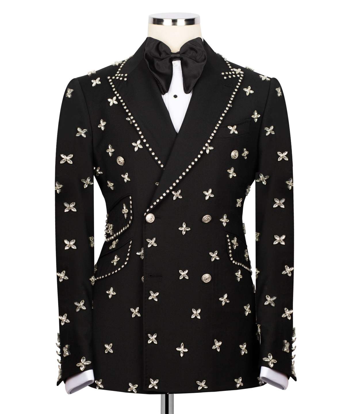 This stylish tuxedo is a showstopper. Featuring 360 degree star embellished jacket and matching pants. Crafted from a luxurious silk-wool blend and designed with a relaxed, tailored fit. Can be paired with multiple accessories for a refined, polished look.