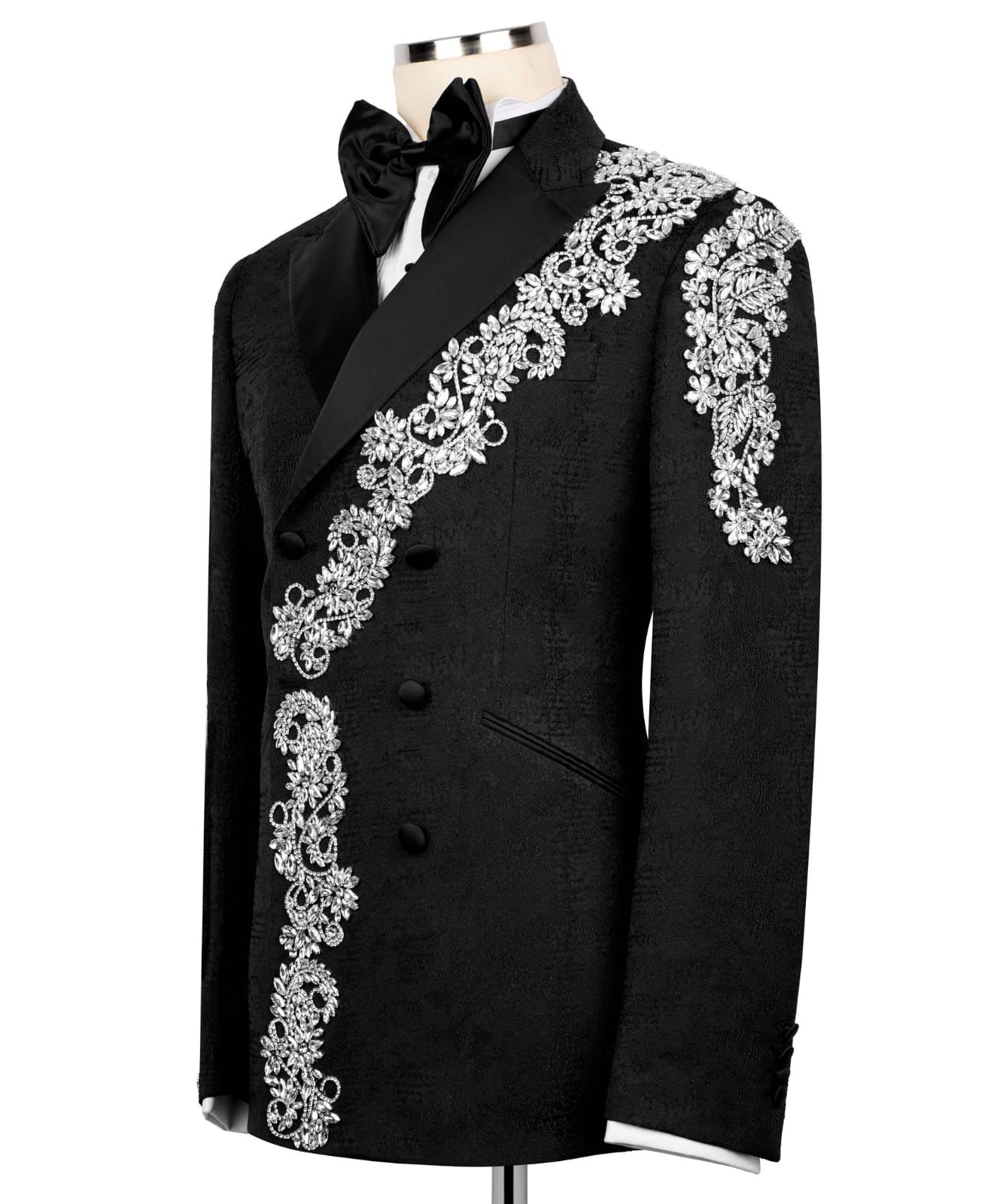 This stylish tuxedo is a showstopper. Features asymmetrically embellished rhinestones on the shoulder and off the cuff. Crafted from a luxurious silk-wool blend and designed with a relaxed, tailored fit. Can be paired with multiple accessories for a refined, polished look.