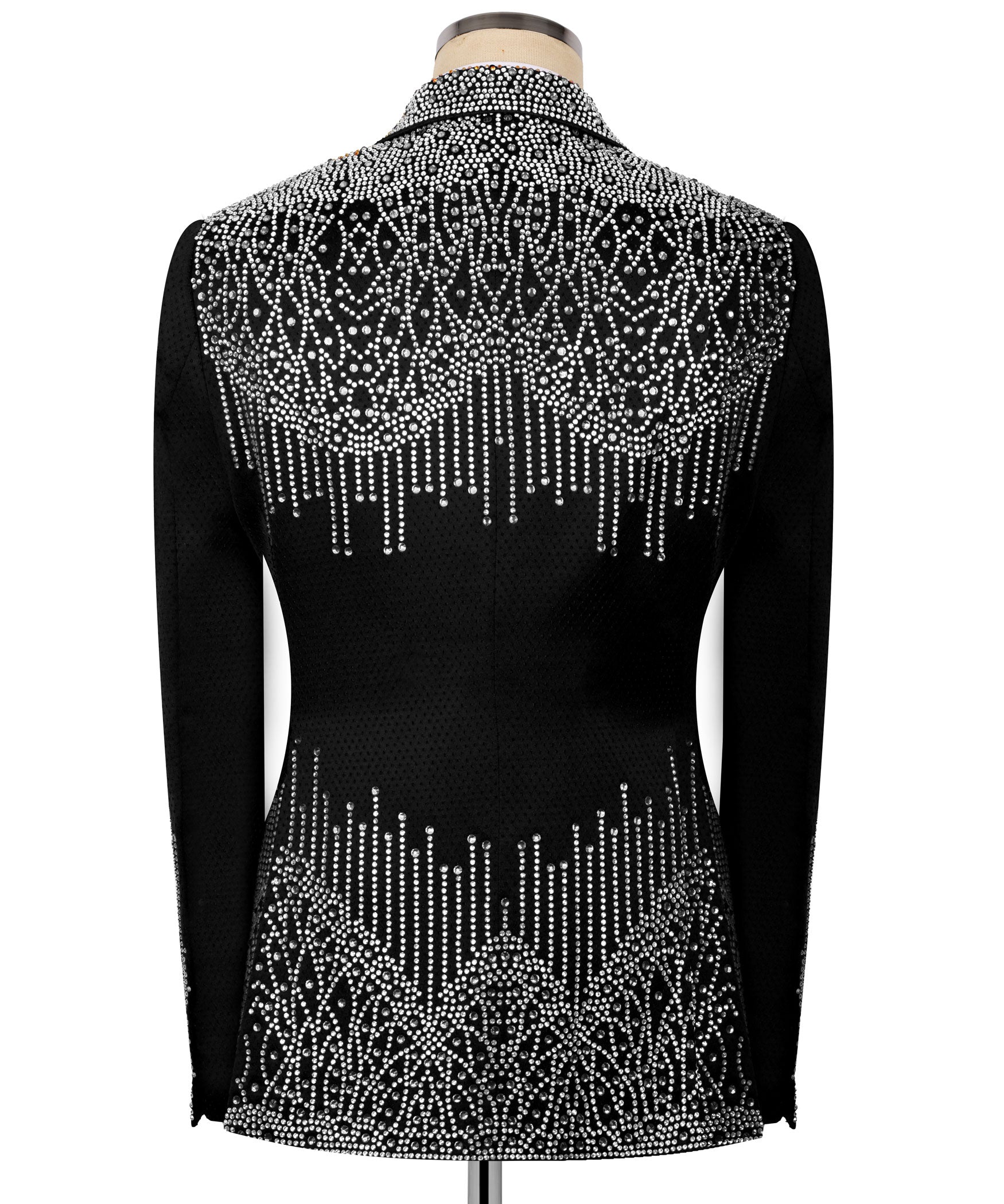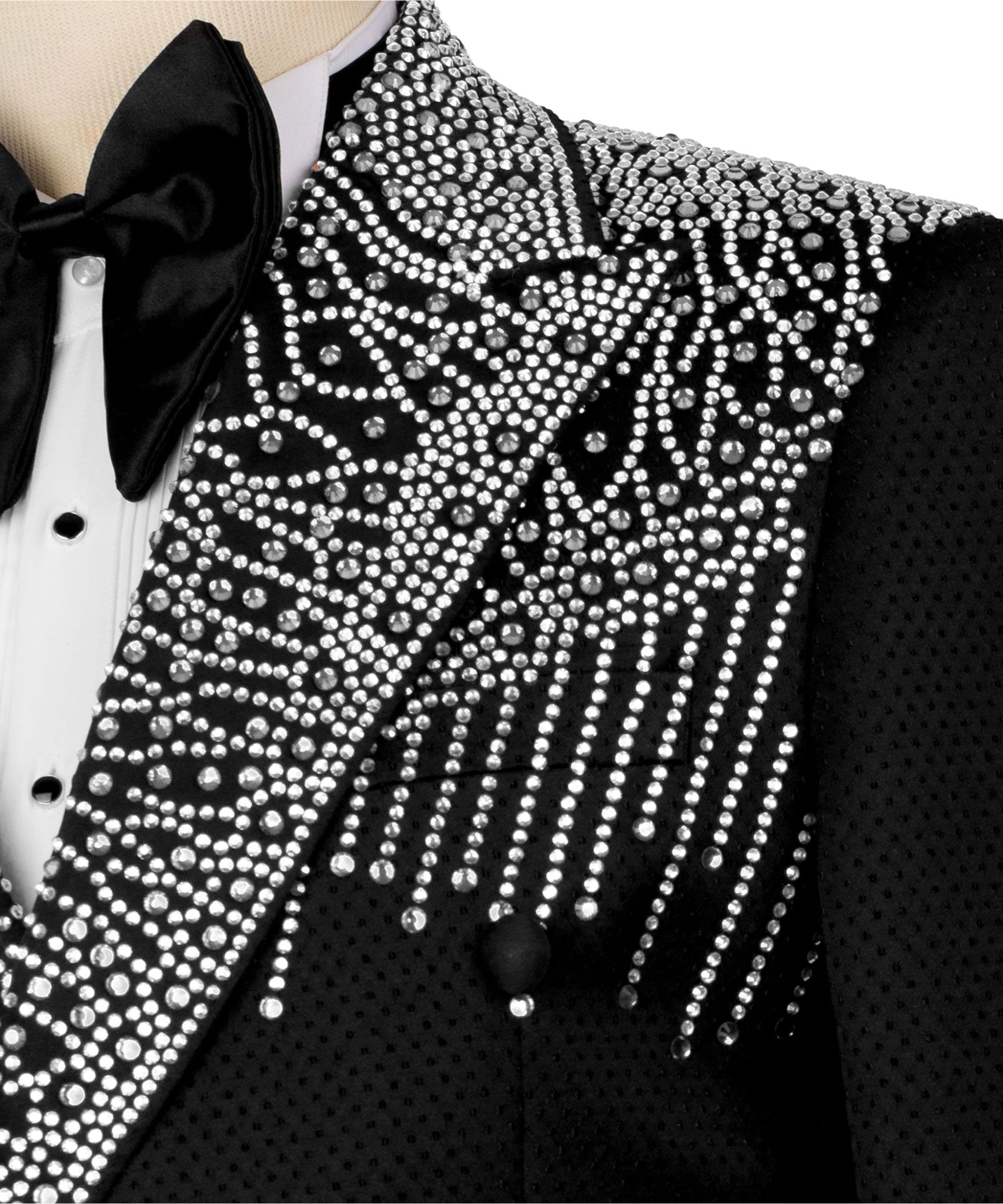 This stylish tuxedo is a showstopper. Features 360 degree embellished rhinestones. Crafted from a luxurious silk-wool blend and designed with a relaxed, tailored fit. Can be paired with multiple accessories for a refined, polished look.