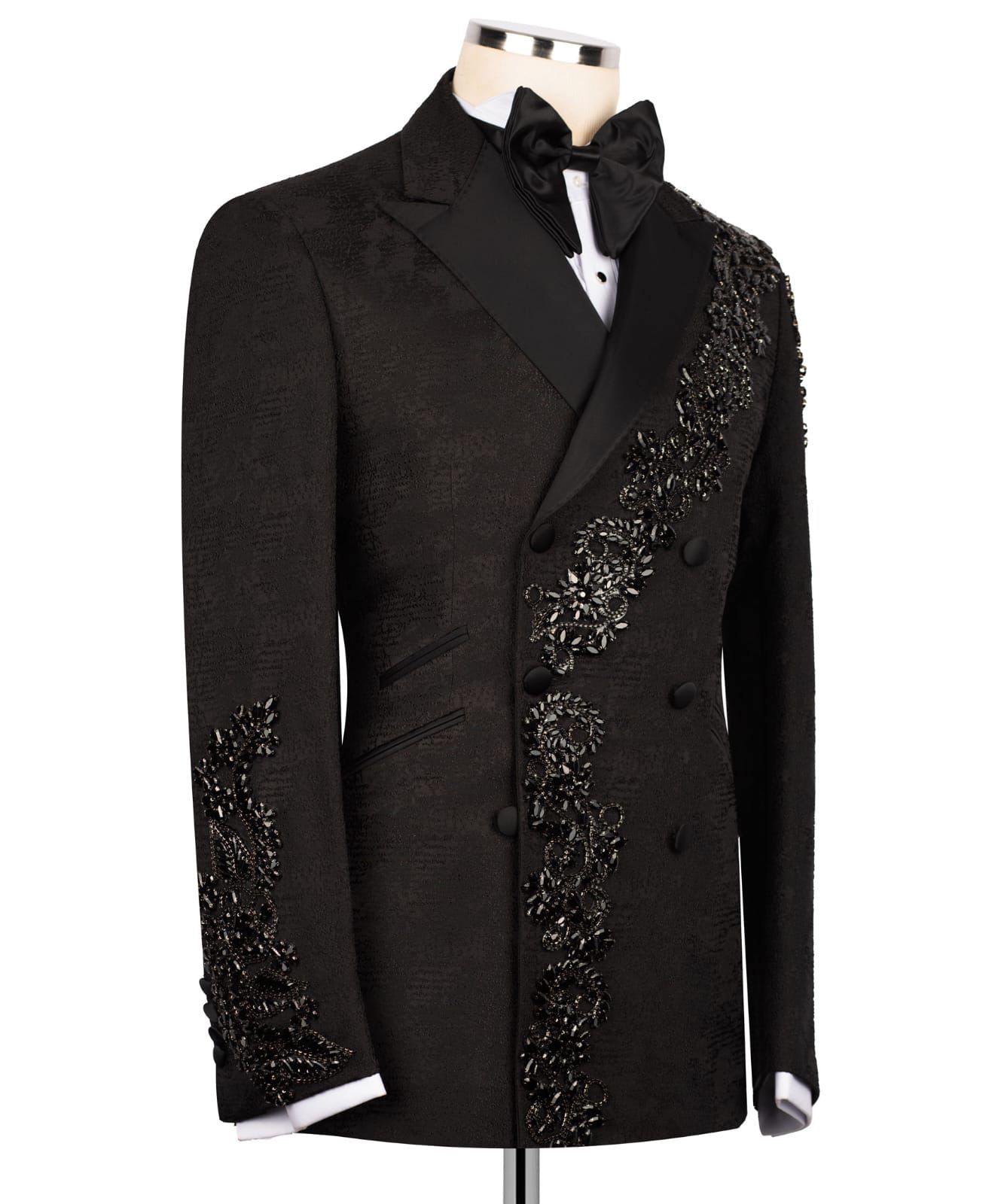 This stylish tuxedo is a showstopper. Features asymmetrically embellished rhinestones on the shoulder and off the cuff. Crafted from a luxurious silk-wool blend and designed with a relaxed, tailored fit. Can be paired with multiple accessories for a refined, polished look.